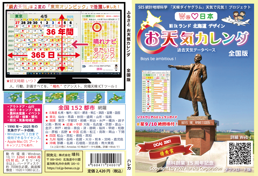 上記受賞後も20年以上改良をつづけ、「ご当地1年365日の中で、好天日や時期がいつなのかを手軽に知りたいのですが…」 という要望をユーザーから受けたのは2012年。まるで「映画の魔法が必要」と思える難題でした。しかし2016年ついに実現。それが日照時間一覧表の「晴れナビ」ツール。さらに小麦や乾草の現場から「今年の天気は例年とズレている…。いつもの統計が役に立たない…」という声も。その暗礁も2021年ついに解決。それが「7日間」(空読み)ツール。そして2023年、デスクトップPCの画面のすべてを占有して表示する長期「10日間」の天候情報を、カレンダー形式の面情報で表示することに挑戦! 実際の生活場面に必要な曜日情報を実現! |