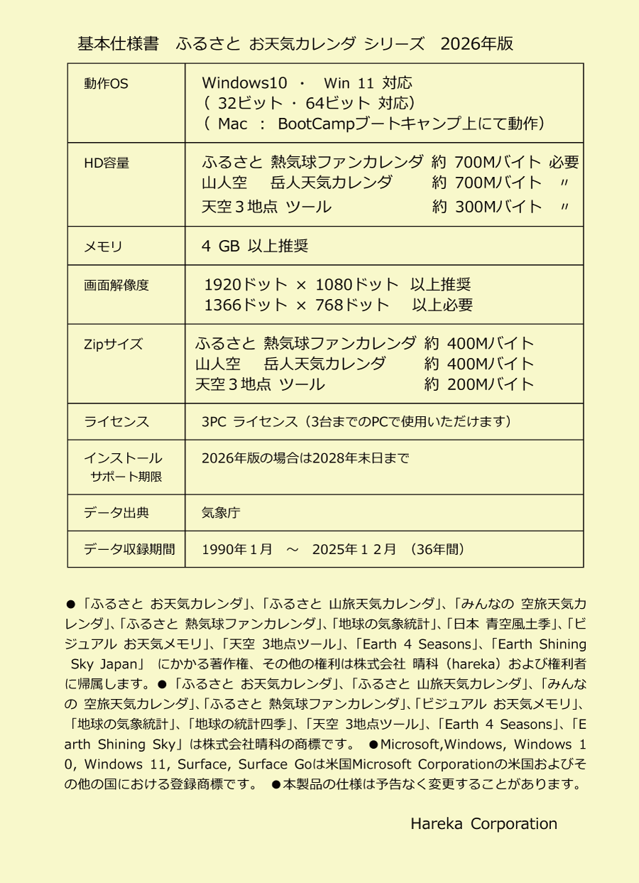 MacOSのブートキャンプ上で動作することを確認。Win10でも11でもOK。写真はMacBook Pro 13インチ。画面解像度は 1280×800の最大解像度で使用。大サイズの3地点ツ−ルでも何とか使えましたが、「卓上 お天気カレンダ」には画面が小さいです。画面解像度 1920×1080以上のMacが必要です。 ※ Mac用Windowsは別途ご用意ください。 |